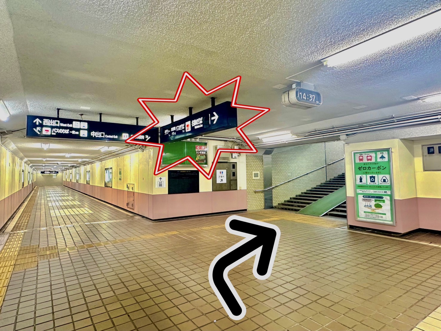 中出口の看板を右に曲がって階段を上がって下さい