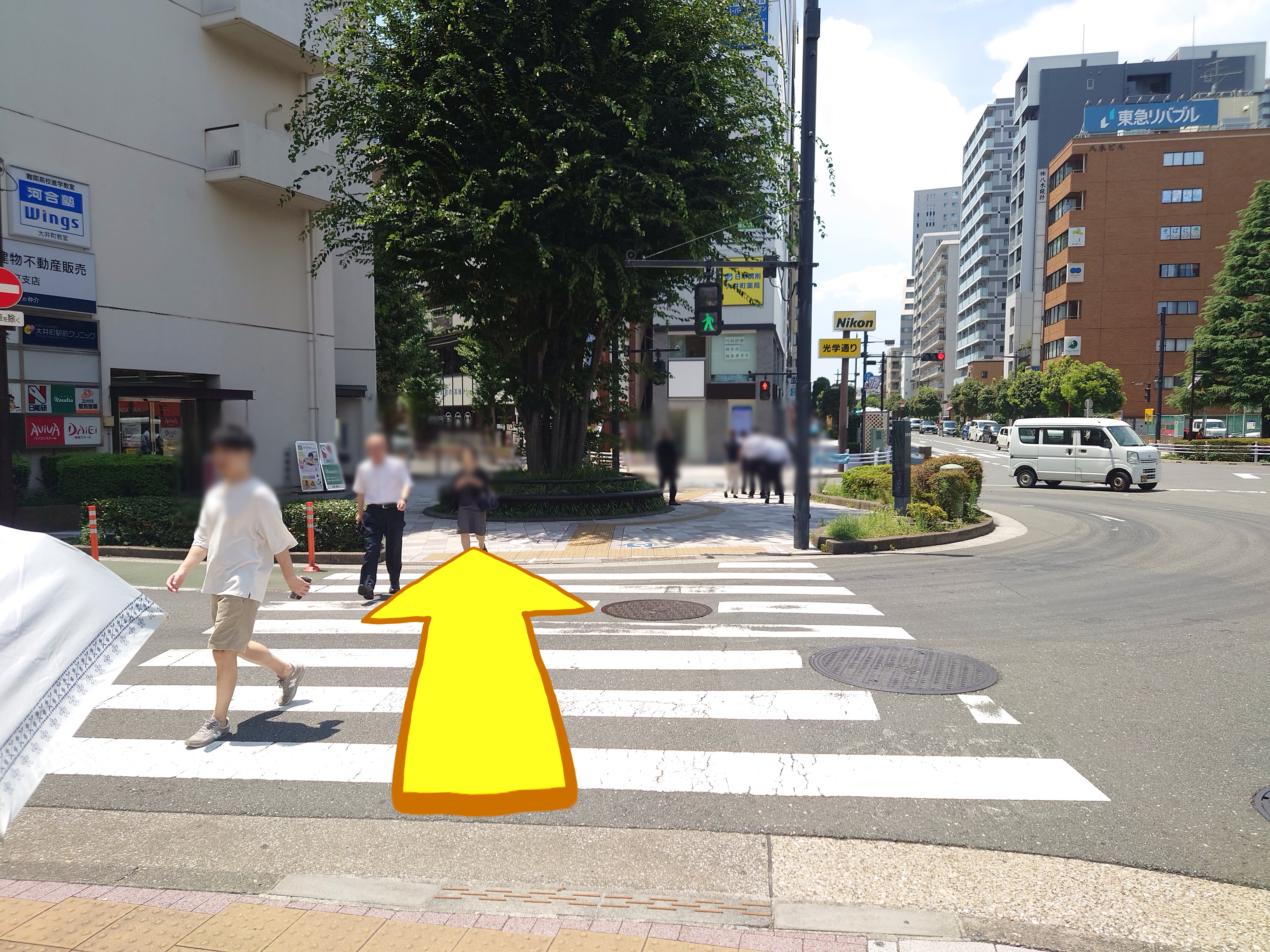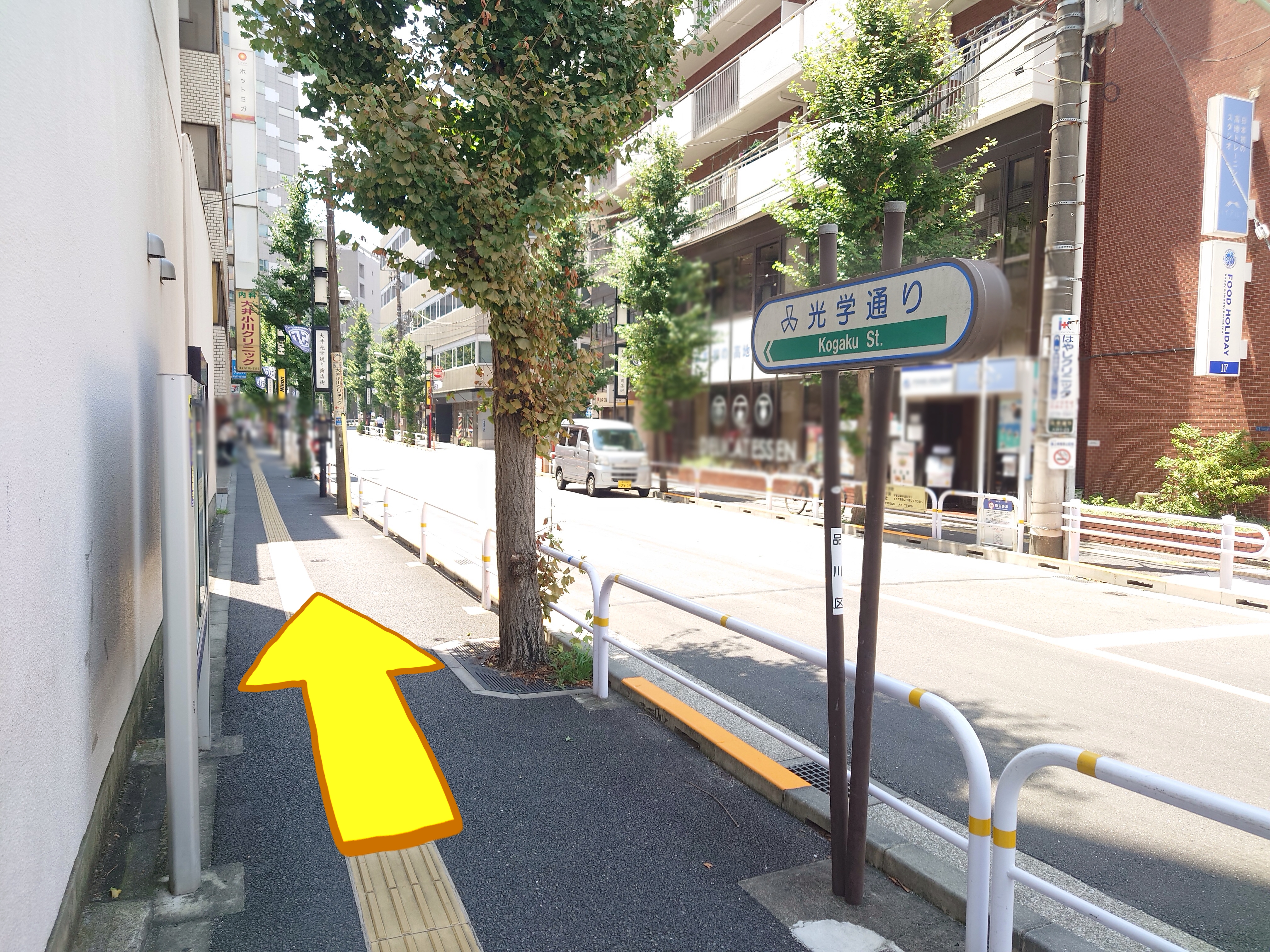 横断歩道を2つ渡ります。光学通りの黄色い看板が見えてきます。